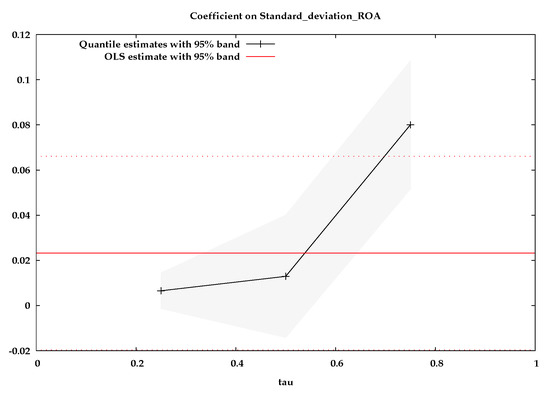 The first relationship concerns the relationship between the standard deviation of rates of return and the standard deviation for the ROA ratio. The estimation results are presented in Table 8. If the OLS estimates are statistically insignificant, the results of quantile regression indicate the statistical significance of the tested relationship for the quantile 0.25 and 0.75. The results indicate that, at the 25, 50, and 75 percentile, a one-unit increase in standard deviation for ROA ratio results in 0.0066, 0.0129, and 0.0800 percentage point increase in the standard deviation of returns, respectively. Taking into account the assessment of all values of the regression coefficient, the conclusion is that the magnitude of impact that ROA ratio on the dispersion of returns increases as a companies’ standard deviation moves from the 25% quantile to those in the 75% quantile.