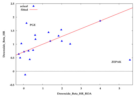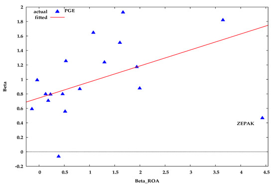 The relationship between market and accounting risk measures is also considered in the context of sensitivity measures. The results of quantile regression indicate the statistical significance of the tested relationship for the quantile 0.50 and 0.75 (Table 10). The accounting beta coefficient for ROA ratio has a much stronger impact on companies with a medium and high level of systematic risk (50% and 75% quantile) than defensive energy companies. The outliers from the quantile regression equation for the median, as shown in Figure 5, are companies representing the electric power generation industry, PGE, and ZEPAK, which have either a high level of systematic market risk or systematic accounting risk. The estimates for these quantiles are more than twice the estimates obtained by the OLS method, which indicates statistical insignificance of the relationship between the beta and beta (ROA) coefficients (Figure 6). The obtained results mean that the measure of energy companies’ reaction to the economic situation on this market significantly influences the growing sensitivity of these companies to the capital market condition.