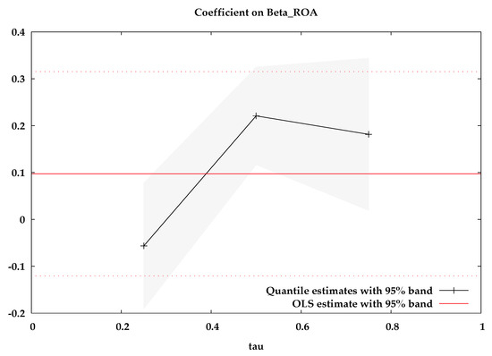 Quantile regression line for beta coefficient vs. beta coefficient for ROA ().