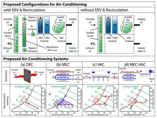 - MEC-VAC system (Figure 3d). This system essentially behaves like a hybrid of the MEC and the VAC systems. The MEC system pretreats the outside air (reducing its temperature) to reduce the cooling coil loads in the VAC system.