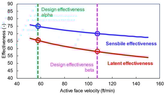 Effectiveness of a high-efficiency energy recovery ventilator (ERV) used as design effectiveness in DesignBuilder at varied design flow rates are presented in Figure 4. Experimental data for the effectiveness was obtained from the literature []. This specific membrane ERV was selected for the study due to its low-pressure drop at the supply air side, high effectiveness towards blocking of a variety of gases, prevention of recirculation of odors into the supply air, and smaller lead time. According to Figure 4, design effectiveness alpha represents the effectiveness at 57.7 ft/min active face velocity, whereas design effectiveness beta represents the effectiveness at 107.5 ft/min active face velocity. The sensible design effectiveness at a 75% heating and cooling flow rate was 0.75, whereas it was 0.70 at a 100% heating and cooling flow rate. The latent design effectiveness at a 75% heating and cooling flow rate was 0.65, whereas it was 0.60 at a 100% heating and cooling flow rate. Figure 5 shows the numerical values of both wet bulb and dewpoint effectiveness of the experimental lab-scale prototypes of the DEC and MEC systems, respectively, for the summer months, obtained from the authors’ previous work []. The design values were used in simulation models developed in DesignBuilder. The design values used in DesignBuilder are presented in Table 1. The developed model was simulated for Multan, Pakistan in EnergyPlus.