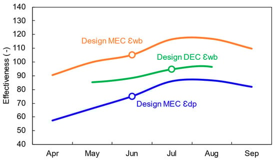 Design effectiveness of lab-scale evaporative cooling systems (i.e., MEC εwb, MEC εdp, and DEC εwb) for DesignBuilder for the summer in Multan [].