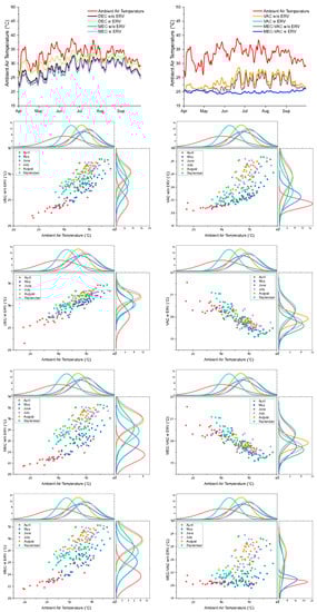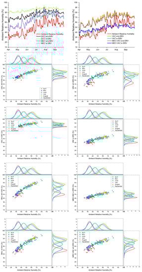 The results from the simulation are presented in Figure 6 and Figure 7. Figure 6 shows the marginal distribution curves of the temperature gradient of the proposed system configurations against the ambient temperature for the summer months of the study area. According to Figure 6, the MEC-VAC system with the ERV and recirculation configuration achieved a maximum temperature gradient of 19.8 °C (on 16 June), with an average 13.2 °C in the summer months. MEC-VAC without the ERV system achieved a maximum temperature gradient of 16.6 °C, with an average of 10.7 °C. It is worth mentioning that the distribution curves in Figure 6 represent the data height in terms of count rather than the relative frequency or density of the data. The DEC and MEC systems could only achieve a maximum temperature gradient of 9.2 °C and 10.8 °C, respectively, without ERV and recirculation configuration, with an average temperature gradient of 4.7 °C and 5.5 °C, respectively. It is worth mentioning that the temperature gradient refers to the subtraction of outside/ambient air and the system outlet temperature. Meanwhile, both the standalone evaporative cooling systems achieved a maximum temperature gradient of 5.9 °C and 10.4 °C, respectively, with the ERV and recirculation configuration in the summer months having an average of 2.3 °C and 5.4 °C. Contrarily, the standalone VAC system achieved a maximum temperature gradient of 13.4 °C and 19.7 °C without and with the ERV and recirculation configurations, with an average temperature gradient of 9.3 °C and 13.2 °C, respectively. From these results, it can be deduced that the standalone VAC system with ERV configuration and the hybrid MEC-VAC system with ERV configuration performed best as compared to the other systems. It could be argued that the VAC with ERV performed nearly equal to the hybrid MEC-VAC with ERV; however, the VAC with ERV system consumed more electricity as compared to the MEC-VAC with ERV system. According to the marginal distribution curves, the MEC-VAC with ERV system yielded an overall smooth performance from the point of view of the supply air temperature. The MEC-VAC with ERV system maintained an overall temperature of ~20–22 °C throughout the summer months. Similarly, the VAC with ERV system also maintained a similar profile of temperature throughout the summer months. The marginal distribution curves of the humidity of the proposed system configurations against the ambient relative humidity for the summer months of the study area are presented in Figure 7. According to Figure 7, the maximum ambient air relative humidity for the summer months was 81%, with an average relative humidity of 48%. It is worth mentioning that the distribution curves in Figure 7 represent the data height in terms of count rather than relative frequency or density of the data. Consequently, the standalone DEC system without and with ERV configuration achieved a maximum relative humidity of 92% and 95%, with an average relative humidity of 76% and 85%, respectively. Similarly, the standalone MEC system without and with ERV configuration achieved a maximum relative humidity of 89% and 90%, with an average relative humidity of 65% and 66%, respectively. The comprehensive results of the study are presented in Table 2.