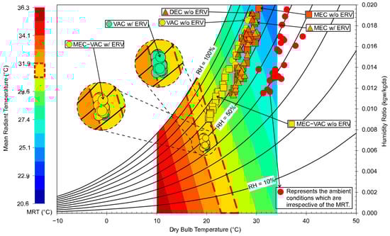 Figure 8 shows the psychrometric performance profile of the proposed system configurations correlating with the mean radiant temperature and human thermal comfort. According to Figure 8, the standalone DEC system without and with the ERV and recirculation configuration achieved a maximum mean radiant temperature of 36.1 °C and 36.9 °C and average MRT of 32.3 °C and 33.4 °C, respectively. However, according to the color-coding in Figure 8, the average MRT of this system should be <26 °C to achieve the optimum human thermal comfort.
