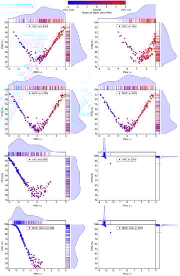 The profile of the proposed system/configurations in terms of the predicted percentage dissatisfied (PPD) and predicted mean vote (PMV) for the summer months of the study area is presented in Figure 9. According to Figure 9, the standalone DEC system without the ERV and recirculation configuration achieved a PMV of −2.43 to 3.43. It is worth mentioning that the distribution curves in Figure 9 represent the data height in terms of count rather than the relative frequency or density of the data. Similarly, the standalone DEC system with the ERV and recirculation configuration achieved a PMV of −0.89 to 3.00. Similarly, the standalone MEC system without the ERV and recirculation configuration achieved a PMV of −2.84 to 3.00. In addition, the standalone MEC system with the ERV and recirculation configuration achieved a PMV of −2.77 to 3.00. Additionally, the standalone VAC system without the ERV and recirculation configuration achieved a PMV of −3.00 to 1.39. On the other hand, the standalone VAC system with the ERV and recirculation configuration achieved a PMV of −2.28 to −3.00. Contrarily, the hybrid MEC-VAC system without the ERV and recirculation configuration achieved a PMV of 0.71 to −3.00. In addition, the hybrid MEC-VAC system with the ERV and recirculation configuration achieved a PMV of −2.20 to −3.00. From the predicted percentage of dissatisfied (PPD) point of view, according to Figure 9, both the standalone DEC system without and with the ERV and recirculation configuration achieved a PPD of 17.6–96.7%, with an average of 50% PPD during the summer months of the study area. Additionally, the standalone MEC system without and with the ERV and recirculation configuration achieved a PPD of 13.4–94.5% and 14.4–4.0%, with an average PPD of 46.3% and 45.7%, respectively. Moreover, the standalone VAC system without and with the ERV and recirculation configuration achieved a PPD of 14.4–98.8% and 84.6–99.5%, with an average PPD of 54.0% and 98.7%, respectively. In the case of the hybrid systems, the MEC-VAC system without and with the ERV and recirculation configuration achieved a PPD of 9.4–99.3% and 83.2–99.5%, with an average PPD of 67.2% and 98.7%, respectively. According to the results, the standalone VAC system and the hybrid MEC-VAC system with the ERV and Recirculation configuration achieved more than 98% PPD throughout the summer months, which caused dissatisfaction among the human subjects. In the case of MEC-VAC with the ERV and recirculation configuration, although high PMV and PPD correlate to discomfort under certain conditions, it could be tackled by using an air-conditioning schedule, economizer, and time-to-time operation of the outside air mixing/recirculation.