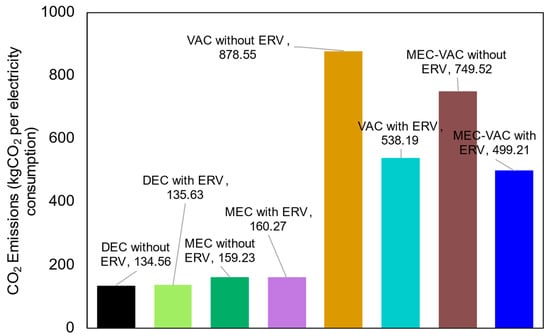 Figure 10 shows the annual carbon dioxide (CO2) emissions per kWh electricity usage of the proposed system configurations. A CO2 emission factor of 0.56 kgCO2/kWh of electricity was used in Pakistan []. According to Figure 10, the standalone DEC system without the ERV and recirculation configuration emitted 134.5 kgCO2/kWh, closely followed by the standalone DEC system with the ERV and recirculation configuration, which emitted 135.6 kgCO2/kWh. Similarly, the standalone MEC system without the ERV and recirculation configuration emitted 159.2 kgCO2/kWh. Similarly, the standalone MEC system with the ERV and recirculation configuration emitted 160.2 kgCO2/kWh. In the case of the standalone VAC system without the ERV and recirculation configuration, the CO2 emissions were 878.5 kgCO2/kWh, whereas it was 538.1 kg/CO2/kWh in the case of the VAC system with the ERV and recirculation configuration. On the other hand, the hybrid MEC-VAC system without the ERV and recirculation configuration emitted 749.5 kgCO2/kWh, whereas the MEC-VAC system with the ERV and recirculation configuration emitted 499.2 kgCO2/kWh.