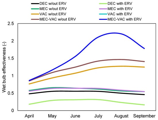 The profile of wet bulb effectiveness (WBE) of the proposed system configurations for the summer months of the study area is presented in Figure 11. According to Figure 11, the hybrid MEC-VAC system with the ERV and recirculation configuration achieved a maximum wet bulb effectiveness of 2.2 in August. However, the MEC-VAC system without the ERV and recirculation configuration was the only system that achieved a maximum WBE of 1.46 in August. Similarly, the standalone VAC system with the ERV and recirculation configuration also achieved a maximum wet bulb effectiveness of 2.2 in August. However, the VAC system without the ERV and recirculation configuration only achieved a highest WBE of 1.27 in August. Contrarily, the standalone MEC system with the ERV and recirculation configuration achieved the highest WBE of 0.64 in August. However, the MEC without the ERV and recirculation configuration achieved the highest WBE of 0.65 in May. Similarly, the standalone DEC system without the ERV and recirculation configuration achieved a maximum wet bulb effectiveness of 0.55 in June. On the other hand, the DEC system with the ERV and recirculation configuration achieved a maximum wet bulb effectiveness of 0.31 in July. According to these results, the standalone VAC system and the hybrid MEC-VAC system with the ERV and recirculation configuration achieved the maximum wet bulb effectiveness; however, the standalone VAC system with ERV and recirculation was unable to achieve the desired mean radiant temperature (as per Figure 8) and was therefore unable to optimally manage the building air-conditioning loads. The hybrid MEC-VAC system, however, produced the best wet bulb effectiveness and was able to achieve the desired mean radiant temperature (as per Figure 8), thereby optimally managing the building air-conditioning loads.