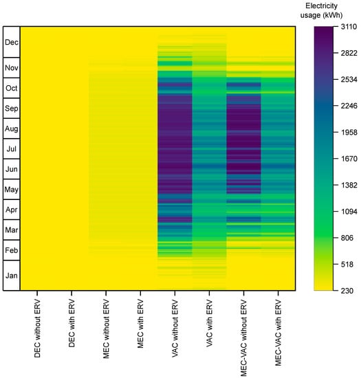 The annual electricity usage of the proposed systems is presented in Figure 12. According to the results, the standalone DEC system without the ERV and recirculation configuration consumed a maximum and minimum annual electricity of 281.6 kWh/day and 231.3 kWh/day, with an average of 266.5 kWh/day annual electricity. Similarly, the DEC system with the ERV and recirculation configuration consumed a maximum and minimum annual electricity of 281.5 kWh/day and 231.7 kWh/day, with an average of 268.6 kWh/day annual electricity. On the other hand, the standalone MEC system without the ERV and recirculation configuration consumed a maximum and minimum annual electricity of 354.6 kWh/day and 231.3 kWh/day, with an average of 315.3 kWh/day annual electricity. Similarly, the MEC system with the ERV and recirculation configuration consumed a maximum and minimum annual electricity of 354.6 kWh/day and 232.4 kWh/day, with an average of 317.4 kWh/day annual electricity. However, the standalone VAC system without the ERV and recirculation configuration consumed a maximum and minimum annual electricity of 3018.6 kWh/day and 231.3 kWh/day, with an average of 1739.7 kWh/day annual electricity. Similarly, the VAC system with the ERV and recirculation configuration consumed a maximum and minimum annual electricity of 2176.6 kWh/day and 240.0 kWh/day, with an average of 1065.7 kWh/day annual electricity. In contrast, the hybrid MEC-VAC without the ERV and recirculation configuration consumed a maximum and minimum annual electricity of 3106.7 kWh/day and 231.3 kWh/day, with an average of 1484.2 kWh/day annual electricity. However, the MEC-VAC system with the ERV and recirculation configuration consumed a maximum and minimum annual electricity of 2176.6 kWh/day and 232.4 kWh/day, with an average of 988.5 kWh/day annual electricity. Evidently, from the results, the standalone evaporative cooling systems were not feasible from the viewpoint of energy savings. However, the standalone VAC and the hybrid MEC-VAC systems with the ERV and recirculation configuration proved to have energy savings throughout the year.