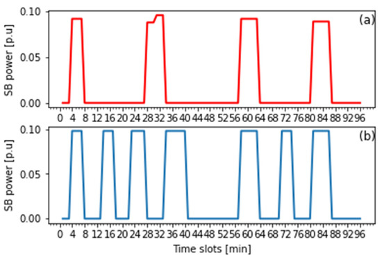 Step 5: When , the SB will discharge the reserve power to regulate the DC bus voltage with the state-of-charge condition at time greater than the minimum state-of-charge level . In that case, the optimal battery dispatching is determined according to Equation (28). Otherwise, the SB will move to the charge status. In case of , the SB will operate in idle mode.