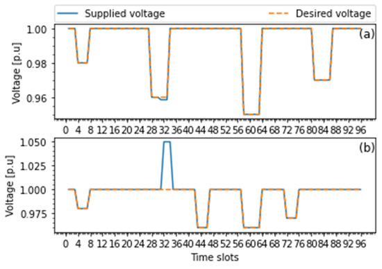 Step 3: When , the voltage-based DR is triggered. The DC bus desired voltage at time t is then calculated according to Equation (29) based on the amount of voltage reduction caused by load shedding. Otherwise, when , no action is performed, and the SB will operate in idle mode. The process returns to step 1 for the next time interval t + 1.
