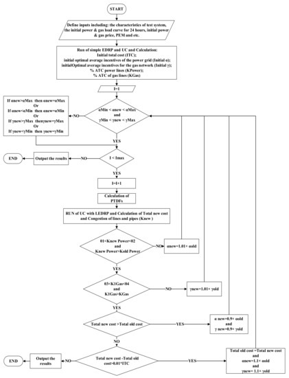 In this section, first, LEDRP implementation in the integrated gas and power networks is presented in detail. Then, the differences in LEDRP implementation in the integrated gas and power networks with the LEDRP implementation in the power network is expressed. The method of determining the optimal average incentive of each network for the implementation of the LEDRP in the integrated gas and power networks is based on: ATC of power lines, gas changes within pipes, PTDFs of each bus relative to critical lines, GTDFs of each node relative to the critical pipe, and optimization of the objective function (15). The algorithm for implementing the LEDRP in both networks is shown in Figure 1. Initial data are first provided as the input. Afterwards, with the implementation of UC and the non-local EDRP in integrated gas and power networks, the total cost (TC) (including the supply cost of energy and implementation cost of DR), critical lines, critical pipes, PTDFs related to critical lines, and GTDFs related to critical pipes are determined. At this stage of optimization, the same incentive of the buses (α) and the same incentive of the gas network nodes (γ) are specified. According to the ATC values of lines and pipes during peak hours, the critical lines and pipes are identified. Then, a coefficient is given to each bus and node, based on the PTDFs and the GTDFs related to the critical lines and pipes, respectively. In this context, each bus or terminal, which is more effective in improving the congestion of electricity transmission lines and gas pipelines, has a higher coefficient. The incentive of each bus or node is obtained by multiplying the coefficient of bus or node at the average incentive of the related network. The new demand for each bus or node is determined through its own incentive and EDRP model (linear or non-linear). Finally, the operation of gas and power networks (including UC approach) is performed with the new demand of each bus per hour to determine the total cost and the condition of the power lines and gas pipes during the optimization.
