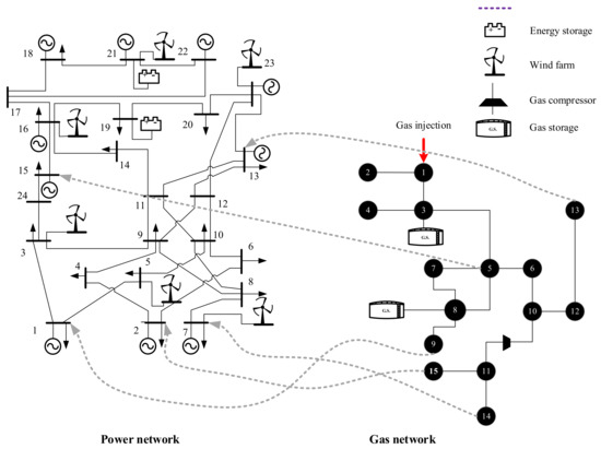 To analyze the performance of the proposed model in different scenarios, the model is implemented on an IEEE 24-bus electricity network and a 15-node gas network (Figure 2) [29]. Due to the non-linear and binary conditions of the optimization problem, the CPLEX and DICOPT solvers of GAMS software [17] are used on a system with the following configurations: processor of Intel (R) Core (TM) i7-7500U @ 2.70 GHz 2.90 GHz and RAM of 12 GB.