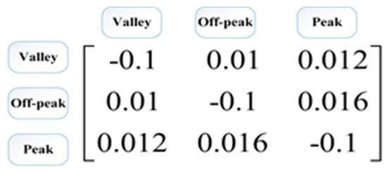 PEM per hour includes internal and external values. The internal elasticity values show the change in a load of the hour t relative to the price change in the same hour. The values of external elasticity present the amount of change in demand at the hour t due to the change in cost at hour t′. The values of internal and external elasticity for a day (24 h) (PEM) are calculated as shown in (5) [22].