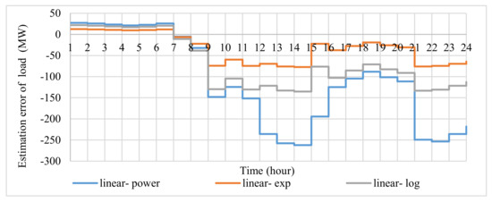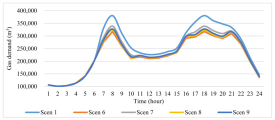 Figure 10 shows the load curve estimation error, which is the difference between linear and non-linear DR models (). In this figure, it is assumed that the estimated demand of the linear model is the real demand, and it is compared with the estimated demand of the non-linear models. The most considerable difference between estimated demand and actual demand occurs in Scenario 10. Negative values indicates that the demand estimated by the model is lower than the actual demand. The power model is a reliable model due to the lower estimate of the peak demand reduction for implementing the LEDRP than other models (with the same incentive). However, it is worth mentioning that according to Table 4 as well as Figure 8 and Figure 9, the LEDRP of the power model in both networks (despite the highest incentive compared to other models when implementing the LEDRP in both networks) reduces the TC by 2%, the average percentage of line congestion by 9%, and the standard deviation of linepack gas changes by 2% less than the linear model (as the best scenario in terms of cost reduction and congestion). Finally, the power model is more suitable for estimating the DR due to the low reduction in peak demand for the integrated gas and power networks, despite increasing costs, lower reduction in line congestion, and changes in linepack standard deviation. Since the cost of unsupplied demand is not considered, considering this cost is possible to offset the increased cost caused by the improving reliability. In other words, if the network operator wants to carry out a conservative estimate to predict the effect of the LEDRP, the power model should be implemented instead of the linear model to estimate the load.