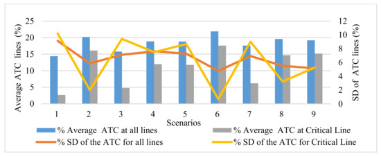 One of the purposes of the LEDRP is to reduce the congestion of power lines and standard deviation of gas changes inside pipes. The congestion of power lines may cause the grid to shut down due to the cascade effect or increase the operating costs of the network by forcing the use of expensive power plants instead of cheap ones. Prior to the LEDRP during peak hours, power lines between 7–8 and 17–22 buses were overloaded. However, after the implementation of the LEDRP, the additional load during peak hours, which may jeopardize the system security is reduced, and the average and standard deviation of ATC percentage of the critical lines, is increased throughout the day. Figure 8 indicates the standard deviation and average of the ATC percentage of all lines and the critical line. As demonstrated, with the implementation of the LEDRP, the average and standard deviation of critical lines and all power lines in all scenarios are improved.