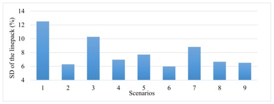 Furthermore, it is shown that Scenario 6 (implementation of the linear model of the LEDRP in both networks) is the best scenario due to a further increase in the mean and further decrease in the standard deviation. The lower standard deviation of gas changes in the gas pipe leads to the more efficient operation of the gas network and causes less stress on the operation of the gas network. According to Figure 9, Scenario 6 results in the smallest standard deviation (5.99%) in the linepack compared to other scenarios, making it a potential candidate for implementation of the LEDRP.