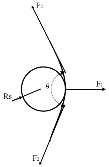 Before the force analysis of the pulverized coal particles was undertaken, the following assumptions were made: (1) the fiber is uniformly anisotropic with elastic thin rods of the same size [27]; (2) single fiber ends are hinged and fixed; (3) pulverized coal particles are equal-diameter rigid spherical, not deformed, not broken; and (4) fiber bending deformation is a small bending deformation. Force analysis of pulverized coal is demonstrated in Figure 3.