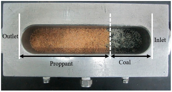 (1) Lay a section of 16/20 mesh quartz sand at the inlet end of the diversion chamber of the FCES-100 fracture deflector, and uniformly mix a certain concentration of pulverized coal to simulate the coal reservoir. Changing the pulverized coal concentration can simulate reservoirs with different pulverized coal production capabilities. In the present study, pulverized coal was sourced from the Qinshui Basin.
