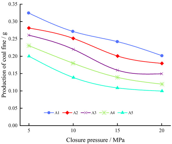 Figure 8 shows a general downward trend in conductivity. This is likely because as the closure pressure increased, the proppant broke down to varying degrees until, finally, it caused the pore throat to become smaller. Clogging is more likely to occur when the pulverized coal migrates. As a result, the conductivity is decreased with the increase of closure pressure; the A1 group had the lowest conductivity under the same closure pressure, and the A5 group had the highest conductivity. This may be predominantly because the A1 group did not have any fiber added. The pulverized coal moved easily with the water flow and blocked the pores of the coal seam, leading the conductivity to decrease. The fibers could form a spatial network structure with the proppant, which would block the migration of coal powder and reduce its damage to the fracture conductivity. Therefore, the addition of fibers helped to increase the fracture conductivity.