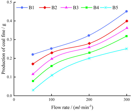 As shown in Figure 9, as the flow rate increased, the pulverized coal output gradually increased, which prevented the coal powder from adhering and depositing. However, some coal powder was still clogged in the proppant pore throat because of the hydrophobicity of pulverized coal. When the flow rate was the same, the output of pulverized coal after the addition of fiber significantly reduced, and the greater the amount of fiber added, the lower the output of pulverized coal.