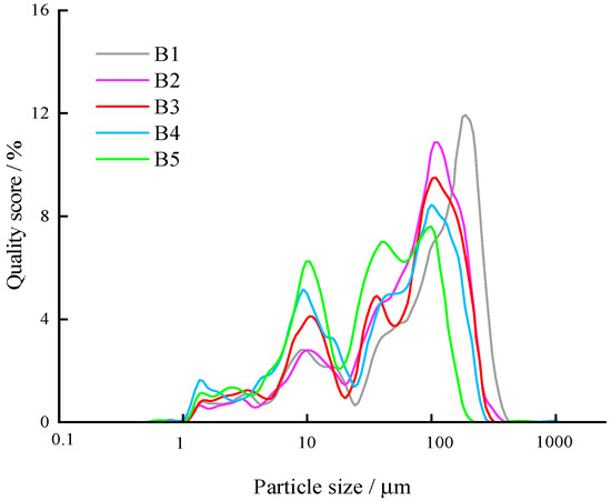 Figure 11, Figure 12 and Figure 13 show the particle size analysis of pulverized coal produced at flow rates of 100, 200 or 300 mL/min, and closure pressure 5 MPa, using a laser particle size analyzer Mastersizer2000 (Malvern Instruments Ltd. UK, Malvern, UK). Figure 12 shows that when the flow rate was 200 mL/min, the pulverized coal particle size distribution curve took the form of a bimodal right polar peak, and the particle size value N varied from 1 to 464 μm. In five controlled trials, B1 had no fiber added. Pulverized coal migrated in large quantities and aggregated into clusters, which resulted in the production of larger particle-sized pulverized coal and increased the probability of plugging the pores of the proppant pack, which would result in lower conductivity; while the remaining four groups had a certain amount of fibers added, the space network structure formed fiber (with the proppant) could easily capture the coal powder, eventually reducing the coal powder migration and agglomeration. The particle size of the producing pulverized coal was relatively small, thereby obtaining a higher conductivity. At a flow rate 300 mL/min, the pulverized coal particle size distribution range was wide, and the particle size value varied from 1 to 1015 μm. The increase of flow rate caused a large amount of pulverized coal to change from a rest to migration state.