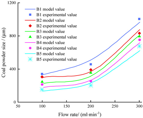 According to the results of the laser particle size analyzer, as shown in Figure 14, the maximum particle size of the producing pulverized coal was obtained. The experimental results were compared with the theoretical values of the model. The overall average error was 14.3%, and the maximum error was 21.4%. The model provides a theoretical reference for the calculation of critical coal particle size.