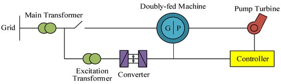 The traditional PSU uses a synchronous motor as a generator motor, and the constant rotational speed limits the unit’s operating capacity and operating efficiency. However, because the DFPSU adopts the doubly-fed motor as the generator motor, the unit can use the excitation power on the rotor side of the motor to adjust the frequency, amplitude, and phase of the rotor voltage and current, thus realizing the adjustable speed. The principal structure is shown in Figure 2.