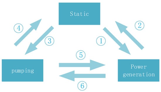The operating states of the DFPSU can generally be summarized as static, power generation, and pumping. However, the output power of the DFPSU is limited due to the characteristic of the turbine to avoid the vibration-heavy operating area, so the operating state of the DFPSU cannot be adjusted at will. When the DFPSU is in the power generation condition, the operating characteristics of the hydroelectric unit are not much different, so it can be treated similarly. Within a limited range, the system frequency can be controlled by receiving an AGC signal adjustment command. When the DFPSU is in the pumping mode, the output power can be changed by switching the operating state to a static state, so that the frequency of the system can be controlled by the generated power change, solving the problem that the output power cannot be adjusted freely. When the DFPSU stops working, it can be regarded as the output state of unit 0, and the system frequency can be controlled by the power change generated by switching the working mode. There are at most 6 possible transition paths between the 3 operating states. Path 1 is from the stationary state to the power generation state; Path 2 is from the power generation state to the stationary state; Path 3 is from the stationary state to the pumping state; Path 4 is from the pumping state to the stationary state; Path 5 is from the power generation state to the pumping state and Path 6 is from the pumping state to the power generation state, as shown in Figure 3.