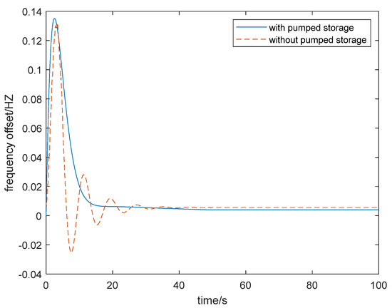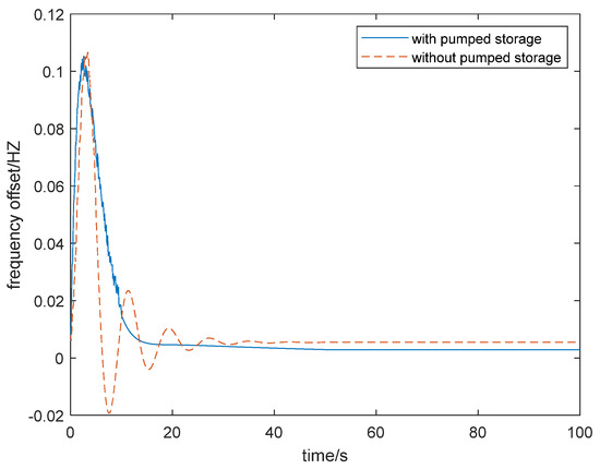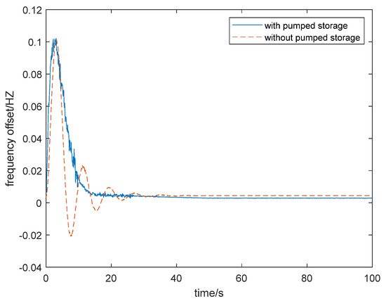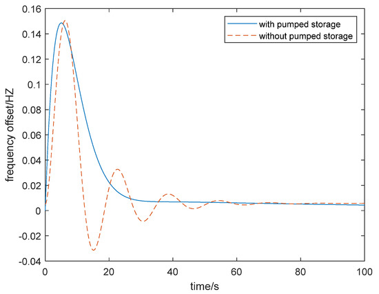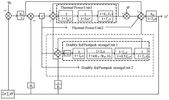 As a mature traditional energy storage method, the pumped storage unit (PSU) occupies an important position in the power system with its great peak shaving ability [1,2,3]. Among them, the doubly-fed pumped storage units overcome the shortcomings of the traditional pumped storage units with non-adjustable rotational speed, and play an important role in improving the operational stability of the power grid and increasing the energy utilization rate, thus becoming one of the mainstreams of new units in pumped storage power plants nowadays. In recent years, with the global consensus to accelerate energy transformation and promote the development of renewable energy [4,5], the large-scale capacity connection of new energy units to the grid has promoted energy conservation and emission reduction work, but at the same time, it makes the stable operation and frequency control of the power system more difficult [6,7]. The sustained increase of the penetration rate of renewable energy in the power system requires that the DFPSU not only has the function of peak regulation, but also needs to have the ability to participate in the frequency regulation of the power grid. Compared with the traditional power grid, in which only the TPU participates in the system frequency regulation [8,9,10], the DFPSU participates in the grid frequency regulation, which has the advantage of automatically tracking the grid frequency changes, and can quickly smooth the grid frequency fluctuations in a short time, and adjust the frequency of the grid. The method is more flexible, the storage capacity is larger, and the environmental pollution is smaller [11,12]. Therefore, in the future, the strategy research on the participation of the DFPSU in power grid frequency regulation will receive more and more attention.