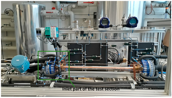 As shown in Figure 3, the test section is supplied with refrigerant through a closed loop. The refrigerant flows from the pump, through the Coriolis mass flow meter and preheater, to the test section where it boils and returns to the condenser. Two adjacent water loops provide heating and cooling water for the heat exchangers and heating of the test section. Temperature-controlled pressurizer, connected to the main refrigerant loop right after the pump, controls the overall system pressure. The pressurizer is a closed vessel containing a large water–refrigerant heat exchanger to control the saturation temperature in the system. The Lauda thermal bath controls the pressurizer temperature.