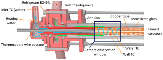 The test section is designed as a concentric tube heat exchanger (Figure 2), which allows a temperature-controlled flow boiling. Hot water flowing inside the copper tube transfers heat to the refrigerant flow (R245fa) in the annulus, which starts to boil on the outer surface of the copper tube at relatively low temperatures (30 °C at 1.8 bar) [21]. The finned structure inside the copper tube provides strong heat transfer enhancement with a homogeneous radial distribution and allows local temperature measurements along the tube axis. As the wall heat flux depends on the temperature difference between the heating water and the boiling refrigerant, no thermal runaway is possible if the critical heat flux value is reached. Both co-current and counter-current operations are possible in the test section. We have used co-current operation (refrigerant and water flowing in the same direction) to achieve the maximum temperature difference between water and refrigerant in the inlet region.