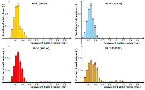 Somewhat different flow behavior is observed at the higher mass flux of 300 kg/m2s (Figure 11). Single-peaked distributions are observed in all cases, regardless of the heating power. For cases with a heating power of 56 W (300–40) and 118 W (300–49), the distributions appear to be approximately normal. The distributions for higher heating power cases at 206 W (300–58) and 325 W (300–68) are somewhat extended toward larger bubbles. It could be expected, that a further increase of the heating power would lead to the appearance of a more pronounced second peak. However, the current design of the experiment does not allow further increase of the heating power, as the existing plastic heating water supply pipes cannot withstand water temperatures above 70 °C.