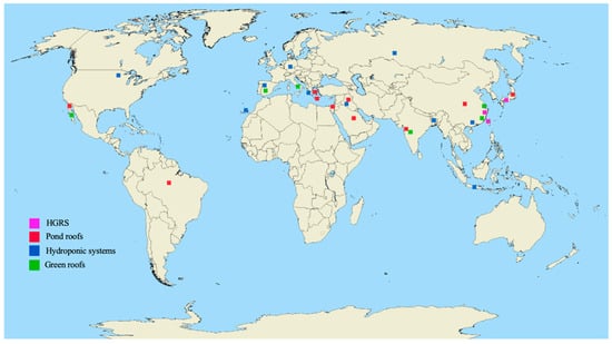 Geographic individuation of analyzed studies on hydroponic green roof systems [12,18,19,20], pond roofs [6,22,23,24,25,26,27], hydroponic systems [17,28,29,30,31], green roofs [4,5,6,8,23,32].