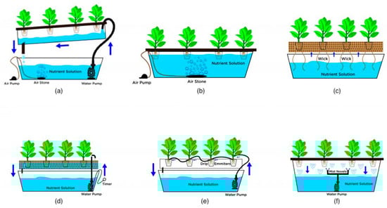 Different hydroponic system techniques: nutrient film technique (NFT) (a); deep water culture (DWC) (b); wick system (c); ebb and flood system (d); drip system (e); aeroponic system (f). Adapted from [44].