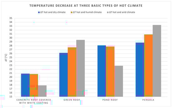 From the analysis of the results found by Alexandri and Jones (Figure 3), it is possible to draw significant information that can be applied to the further study of HGRS. For instance, focusing on the green roof and pond roof configurations, it can be noticed that, in hot and dry climates, both perform better than the white-coated concrete roof, with the pond roof performing slightly better than the green roof. On the contrary, in hot and arid climates, the pond roof provides a significantly lower temperature decrease since, despite the contribute of evaporation, as the amount of heat that gets stored in the water due to high temperatures and solar radiation causes the surface temperature to increase significantly at night.