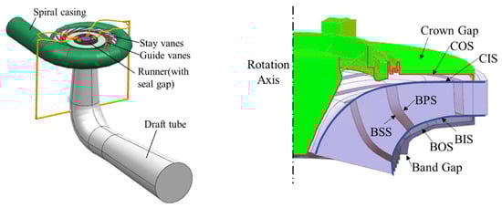 Before CFD simulation, the calculation domain needs to be meshed. Figure 2 left shows the calculation domain, including spiral casing, stay and guide vane, runner, and the draft tube. It is worth to be noticed that the PBPs are considered in the model giving the PBPs have a large influence on the axial force of hydraulic turbine units. The PBPs are introduced from the crown gap (after the seals) to the draft tube. With the pipe, the pressure of the crown gap can be decreased then the pressure difference between the upper and lower side of the runner could be reduced. The pipelines are arranged uniformly along the circumference. In our case, four pressure balance pipelines are set with an angle difference of 90°. In order to better analyze the hydraulic thrust force, different positions of the runner, including the blade suction side (BSS), blade pressure side (BPS), crown outside surface (COS), crown inside surface (CIS), band outside surface (BOS), and band inside surface (BIS) have been marked on the model (Figure 2 right). The axial force will be the resultant of the forces on all of these surfaces. In this study, the calculation domains of draft tube, runner and its seal and gap, guide vane, stay vane, spiral casing, and PBPs were separately meshed (Figure 3). The components are meshed by a structured/unstructured unit hybrid grid structure. Given the irregular structure in the spiral casing, both unstructured tetrahedral grid and structured boundary layer grid are used. Hexahedral structured mesh elements are used on the stay vanes and guide vanes and the boundary layer is divided around the blades. For the runner domain, the hexahedral structured grid is applied and the boundary layer grid is adjusted to make sure the y+ is between 20 to 300. Since the gap of the crown and band has a significant influence on the calculation of the axial force, the gap grid is particularly refined by hexahedral grid to save the storage space, improve computing and addressing capabilities, and enhance the storage space computational convergence.