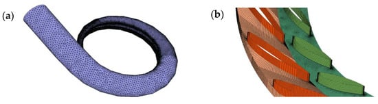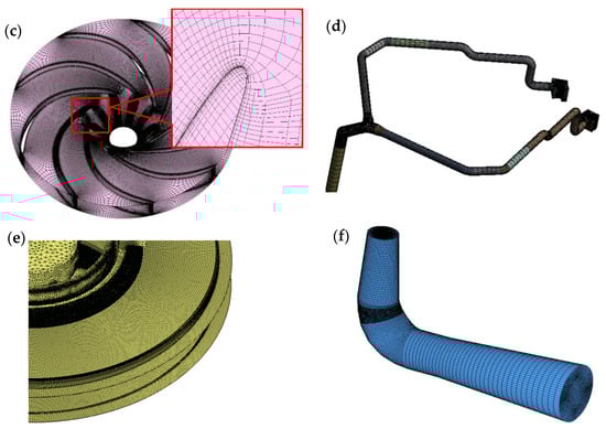 Mesh of the flow field of the pump-turbine: (a) spiral casing; (b) stay vane and guide vanes; (c) runner; (d) PBPs; (e) seal and gap of the runner; (f) draft tube.