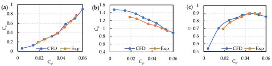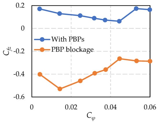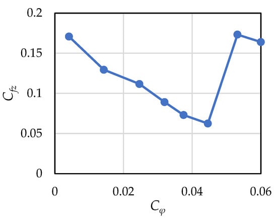 The variation of the axial force coefficient Cfz of the unit with the discharge coefficient Cφ predicted by CFD is shown in Figure 10. The axial force coefficient Cfz is defined according to Equation (14):