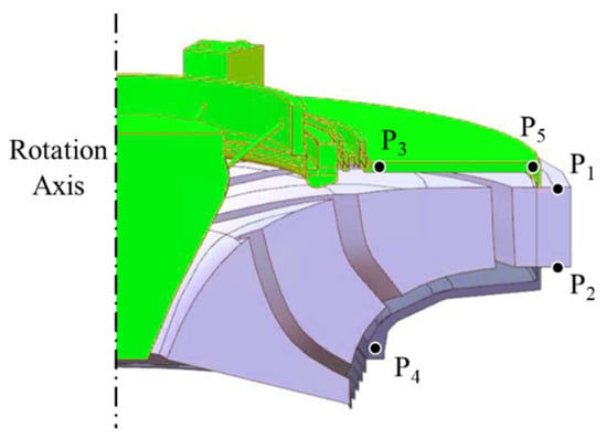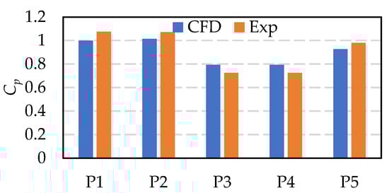 In addition, the simulated pressure under the rated pump condition was also compared with the field test. Five monitoring points have been selected as shown in Figure 5, which are the upper (P1) and lower (P2) vaneless space, crown (P3) and band (P4) gap before seal, and crown gap entrance (P5). Three conditions were used for the comparison. The inlet flow velocity is set according to the rated discharge and outlet static pressure is 1 atm. The guide vane opening coefficient Ca equals to 0.85. All of the above boundary conditions were configurated as same as the on-site measurement. The relative pressure coefficient Cp is compared for each position in Figure 6. From the figure, all of the errors between the CFD calculation and the experiment result are lower than 10% so that there is a good agreement between them. Therefore, it is reasonable to say that the mesh and the boundary configurations can accurately reflect the researched pump-turbine’s flow characteristics. The determined numbers of the nodes for each component are listed in Table 2.
