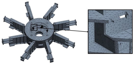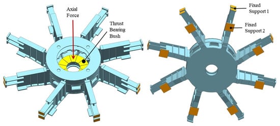 To evaluate the effect of different operating condition on the structure, the support bracket is modeled, and different axial forces have been applied to it. As shown in Figure 7, the diameter of the basic support part is 4 m while the diameter with eight supporting arms is 10 m. The end of eight arms were fixed by the concrete foundation and the bottom were connected with the generator stator. In the simulation, the end of supporting arms and the bottom were set as fixed support. In the pumped storage unit, the axial loads including the hydraulic thrust of runner flow and the weight of runner are loaded on the thrust bearing. In this study, the axial loads were set as a certain range value and loaded on the bushes of thrust bearing uniformly. The material of the structure is Q345 and the density is 7.75 × 103 kg/m3. The Young’s modulus is 2.1 × 1011 Pa. The Poisson’s ratio is 0.3.