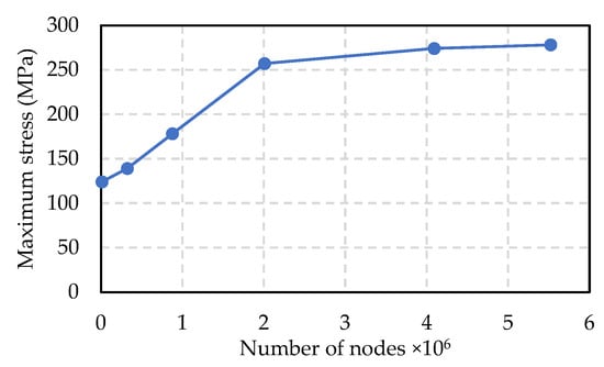 Tetrahedral meshes were used for the structure model meshing shown in Figure 8. Since stress concentrations often occur at the corner of support plates, the fillets of the plates were modeled accurately. The mesh at these sensitive areas was refined to avoid stress concentrations due to the mesh. Mesh independence check has been performed on the bracket. Figure 9 shows the variation of the maximum stress on the structure changing with the number of the nodes of the mesh. It can be seen that when the number of the nodes is 0.55 million, the changing rate is lower than 2%. Finally, there are 0.55 million nodes and 0.3 million elements in the meshes used in this study.