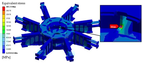 The equivalent stress distribution of support bracket at maximum axial force (Cφ = 0.0142) with PBP blockage.
