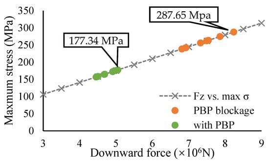 The CFD and FEM analysis on the turbine unit shows the maximum stresses are 177.34 MPa with PBPs and 287.65 MPa with blocked PBPs, respectively. When the PBPs are blocked, the sum of maximum static stress and dynamic stress could exceed the allowable stress of the material of the support bracket. Besides, according to the Linear Elastic Fracture Mechanics, the mean stress has a great influence on the accumulative damage of the material. This low amplitude stress will contribute to the High Cycle Fatigue, which lead to a rapid propagation of the crack []. Therefore, the blockage of PBP would be dangerous for the safety of the support bracket.