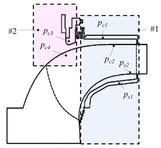 The causes of the axial force on the runner will be analyzed here. The meridional map of runner, including the crown and band gap, is shown in Figure 14. The reason for the axial force on the runner is relatively complicated. The main causes come from the pressure difference between the crown gap and the runner, and the pressure difference between the band gap and the runner. From the division #1 and #2 in the figure, it can be seen that in division #1, the pressure of the crown gap is pc1, the pressure of the adjacent position of the runner is pc2, the pressure of the band gap is ps1, and the pressure of the adjacent position of the runner is ps2. Usually, pc1 ≈ ps1 and pc2 ≈ ps2. Therefore, pc1 − pc2 ≈ ps1 − ps2, that is, the axial force of the runner in the division #1 is balanced. On the contrary, in division #2, the pressure pc3 in the crown gap and the pressure pc4 adjacent to the runner are difficult to balance, causing the runner to receive upward or downward axial force.
