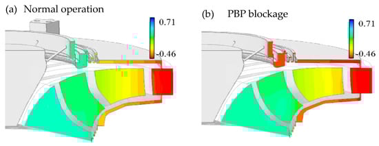 Comparison of pressure distribution between (a) normal condition and (b) PBP blockage condition at Cφ = 0.032.