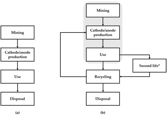 LIB life cycle: (a) actual (b) proposed. Adapted from [29]. * Second life depends on the cathode’s chemistry and the recycling industry’s location. For example, in some places in China, the second life of NMC batteries will be banned.