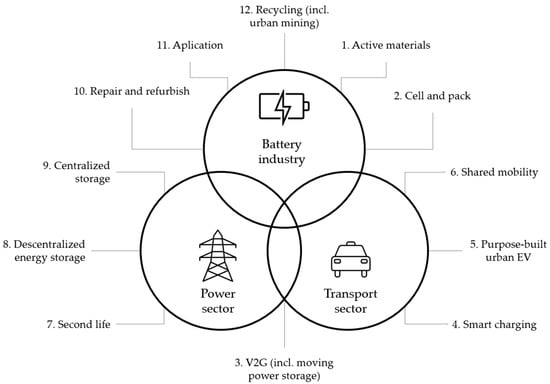 Circular value chain of a battery engaging the energy and transport sectors. Adapted from [32].
