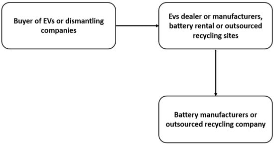 Another possible route is through outsourced recyclers, where the battery is sent for recycling after the consumer sends the EV to the dismantling (scrap) company, which will send the battery for recycling, or the consumer directly delivers the battery to the third-party recycler (Figure 6) [33].
