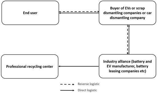 The battery goes through different paths depending on the participation of consumers and manufacturers according to recycling routes and reverse logistics [33]. In European countries and the United States, battery manufacturers usually assume responsibility for recycling, coordinated by electric vehicle manufacturers.