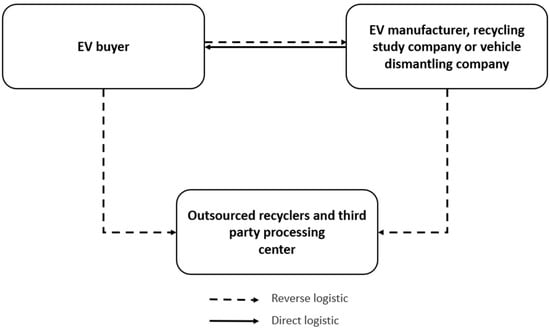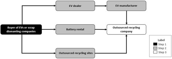 In Figure 3, the EV user initially sends the used LIB to a buyer of EVs or a dismantling company, which sends the LIB directly to the battery rental location, recycling facilities, or EV factories through an EV distributor. Finally, the LIB manufacturers receive the battery from EV manufacturers and battery rental companies. Another option is that outsourced recycling companies get the battery from outsourced recycling sites (collection points, for example).